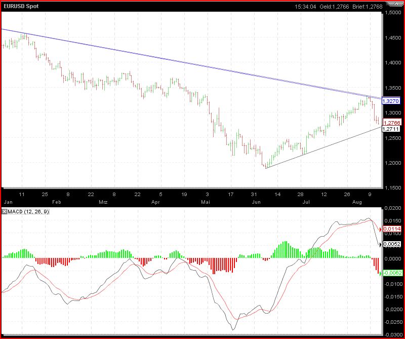 Woran machst Du das bitte schön charttechnisch fest. Wenn ich auf den Chart schaue, hat der Euro aktuell bei 1,273 - 1,275 eine 3fach Unterstützung bestehend aus