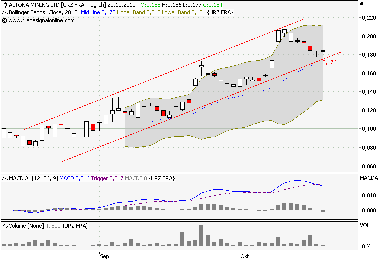 Der Kurs von Altona Mining hat sich seit August 2010 verdreifacht und hat eine intakte Aufwärtsbewegung ausgebildet. Step bei Step steigt der Kurs weiter an. Der letzte Abprall an der unteren Linie, zeigt weiter steigende Kurse an.