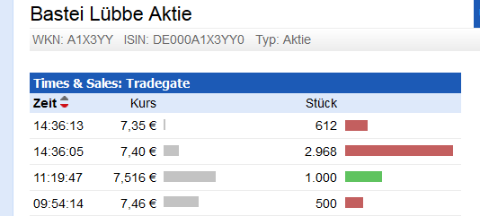 Radelfan: Bei weiterem Abtauchen bin ich mit Käufen dabei. Soeben wurden 7,25 Euro erreicht: mein altes Kursziel in Löschung zum 29.11.2013. So kann's in der Tat gehen. Neues gibt's auch bei Mensch & Maschine, da werden Lizenzen zurückbeordert (mal prüfen?). Bastei Lübbe könnte durch Verkäufe enttäuschter Anleger auch auf knapp 7,00 Euro fallen, oder? Würdest Du dann ggfs. auch einsteigen? Bis bald. Einige andere Käufe haken, deshalb (TPSA) sind bei mir noch Mittel frei!