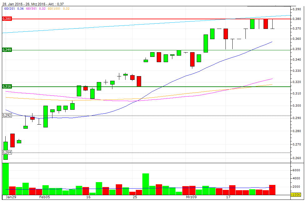 Anleger, die in der vergangenen Woche bei ca 36,5 / 36,8 Cent verkauft haben und den Zug zunächst wegfahren sahen, nehmen nun die Chance wahr, um bei derzeitigen Kursen wieder aufzuspringen!