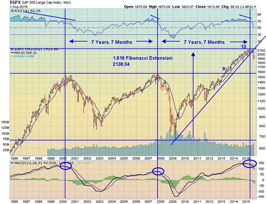 Beim Anblick wird klar, das ein Wirtschaftszyklus in den USA und dem S&P ca. 7Jahre und 7Monate beträgt. Am Ende jeder Periode bildet sich ein Major High aus, wonach es im weiteren Verlauf immer zu massiven Kursverlusten/ Bärenmärkten kam. 2000/2001 die Internetblase, 2008 die Immobilienblase und 2015.....vermutlich die Anleihenblase???