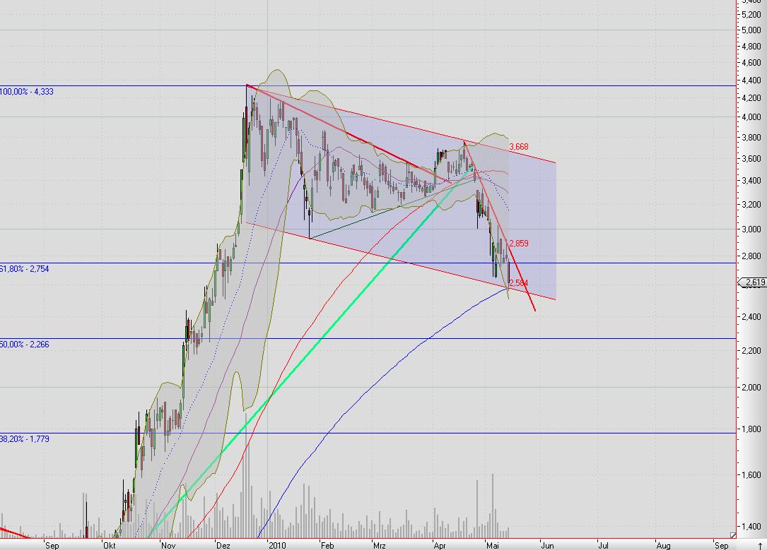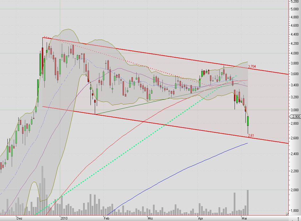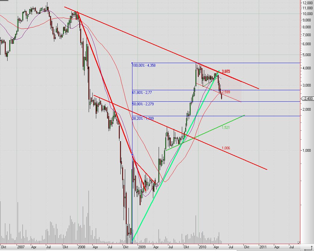 200 tage linie und der flache abwärtstrend haben sich heute entgültig erledigt. bei 2,30 noch das 50 % fib. retr. des letztjährigen anstieges von 20 cent. danach kommt nichtmehr viel. 1,50. 1,00 eur.