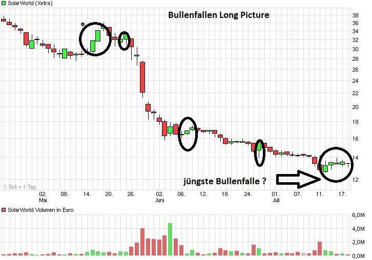 SWVK Solarworld ist so unglaublich schwach, dass ich den Short weiter halte auch wenn schon extrem ueberkauft.Heute um ca 15Uhr deutscher Zeit gab es einen long Volumenspike nach News mit ueber 50k Stueck und der wurde direkt wieder extrem abverkauft. Fuer mich ein klares Zeichen; das jede Moeglichkeit zum Abverkauf genutzt wird.Handelsvolumen ist sehr klein; grosse Adressen haengen in dem Muell fest und verkaufen in jedes Volumen rein, dass Ihnen entgegen kommt....."