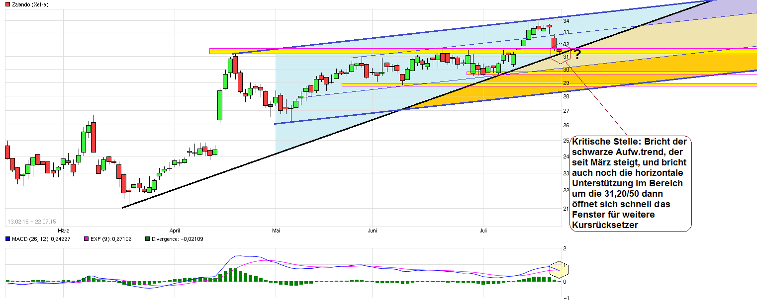 Paradies für Schnorrer: Zalando-Kunden zahlen ungern - 22.07.15 23:42 Uhr http://deutsche-wirtschafts-nachrichten.de/2015/...den-zahlen-ungern/ "...Der Online-Modehändler Zalando beklagt leere Kassen trotz steigender Umsätze: Die Kunden kaufen gern, zögern aber beim Bezahlen. Zalando will trotzdem großzügig bleiben.... Dies setzt Europas größten Online-Modehändler zunehmend unter Druck. Zwar stimmt das Wachstum – der Umsatz stieg laut vorläufigen Zahlen von April bis Juni um 33% bis 35% auf 727 bis 738 Mio. Euro – die Gewinnentwicklung kann mit diesem Anstieg aber nicht mithalten. Das EBIT beträgt lediglich zwischen 22 und 37 Mio. Euro. Oftmals zahlen die Onlinekäufer erst nach langwierigen Mahnverfahren oder garnicht. Das Problem ist im Onlinehandel bekannt, doch die meisten Konkurrenten haben Präventionsmechanismen implementiert.Diese sorgen dafür, dass die Personaldaten während des Kaufvorgangs sekundenschnell abgeglichen werden und bei Kunden, die als nicht zahlungskräftig eingestuft werden, die Rechnungsoption gar nicht erst angeboten wird. Wie sich die Zahlungsmoral bei Zalando verbessern soll, bleibt unklar. Die Berliner wollen an ihrem kundenfreundlichen aber inkassoerschwerenden Retouren- und Bezahlregelungen festhalten.Bei Zalando zählt immer noch einzig der Umsatz und Marktanteil. Die Investoren störte das bislang nicht. Die Börse wird aber unruhig. Die Aktie gab um fast 5% nach. Das liegt vor allem an der Ankündigung, dass Zalando seinen Ausblick anpassen will. Am 13. August stehen die endgültigen Zahlen und aller Voraussicht nach auch eine Gewinnwarnung ins Haus.