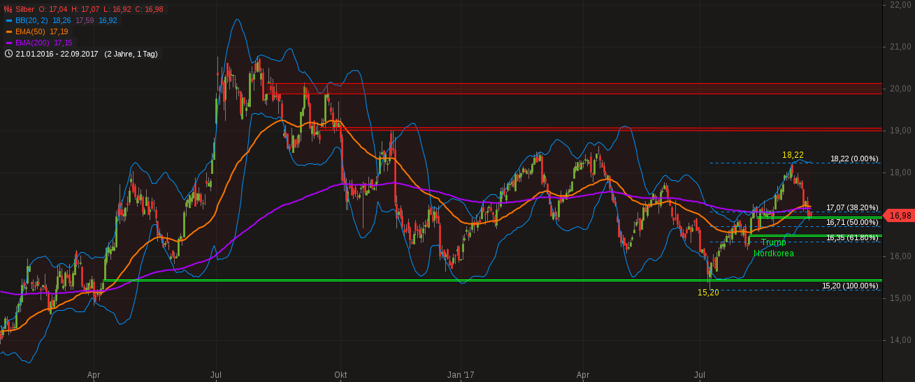 Nach dem montäglichen Sprint schlug Silber hart auf der Kreuzunterstützung, gebildet aus EMA 50, EMA 200 und Aufwärtstrendlinie 7.7.2017, auf. Die dabei freiwerdende Energie liess das Edelmetall am Dienstag ein wenig in die Höhe schnellen. Doch bereits am Mittwoch wurde die Unterstützung erneut in Angriff genommen, und sie wurde dann schon am Donnerstag schwach und gab dem Abwärtsdruck nach. Nun ist es die Aufgabe des bereits 7-fach getesteten Fensters, Silber vor einem weiteren Kursabsturz zu bewahren. Aber noch zeigen die Kerzen keine Umkehrsignale an.