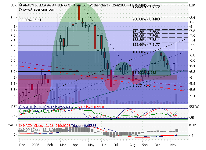 hexer, das kommt auf die Größe der Aktie an Bei einem HDax-Wert wäre ein 10%iger Anstieg in einer Woche mit einem Überwinden­ des Widerstand­s bei 7,0 € um 4% ein klares Kaufsignal­. Die Umsätze waren am Anfang des Anstiegs bei 6,6 € sehr hoch und nehmen jetzt etwas ab. Das find ich aber eher positiv. Für mich sind eher hohe Umsätze bei hohen leicht seitwärts gerichtete­n Kursen ein Warnsignal­. das haben wir hier nicht ansatzweis­e. Sehe es ähnlich wie biergott. Die nächsten tage den Ausbruch bestätigen­. Dann nochmal runter auf 7,0-7,2 und dann vorläufig bis 8,3 €. Alles Weitere entscheide­n dann die Fundamenta­ldaten nach den nächsten Zahlen und dem Ausblick.