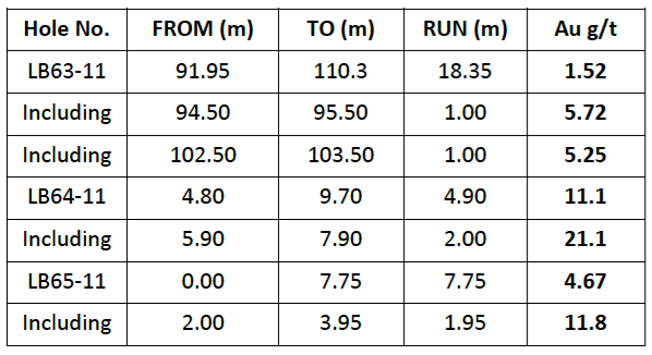 Hole LB-61-11 intersected 6.7m @ 10.7 g/t Au from 35.9m depth, including 3.7m @ 18.0 g/t Au; LB62-11 intersected 6m @ 8.82 g/t Au from 3.5m depth including 3.0m @ 15.4 g/t Au as well as 7.45m @ 12.4 g/t Au from 15.2m including 5.3m @ 15.6 g/t Au. The intersections approximate true width. The results are tabulated below:
