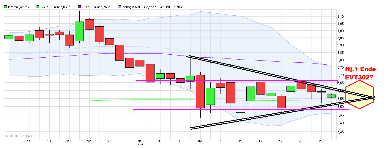 jetzt in eine Dreieckspitze reinläuft. Allerdings läuft auch der Gesamtmarkt aktuell nur seitwärts in einer recht engen Handelsspanne und wartet auf grünes Licht in Punkto Griechenlandlösung. Verkündung der EVT302 Resultate würden dann den Ausbruch in die eine oder andere Richtung bringen, wenn Roche/Evotec im Zeitrahmen bleiben und die Ergebnisse noch im 1.Hj. wie erwartet feststehen ( .... und dann natürlich auch sehr zeitnah per adhoc weitergegeben werden an die Öffentlichkeit). Na, warten wir mal ab, ob das mit dem Hj.1 als Stichtag wirklich eingehalten wird. Spätestens nächsten Mittwoch wird man es ja dann sehen, ob es dann doch nicht erst im 2.Hj. rauskommt. Hätte aber auch nichts dagegen, wenn man z.B. heute schon nach Börsenschluß seitens Evotec was verkünden würde. Das fliegen in der Warteschleife nervt doch langsam etwas.