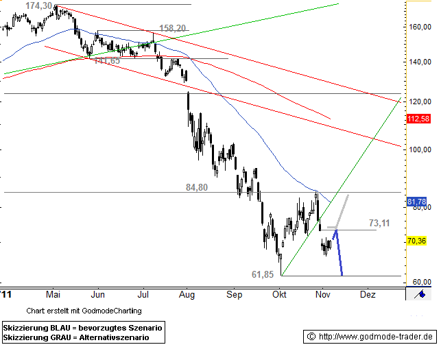 Seit Anfang Mai bestimmen trotz einiger Unterbrechungen die Bären ganz klar die Richtung in der Aktie von Wacker Chemie. Dabei fiel die Aktie von 174,30 Euro auf 61,85 Euro. Nach diesem Tief vom 04. Oktober erholte sich die Aktie zwar für einige Tage, aber sie scheiterte am Widerstand bei 84,80 Euro. Anschließend musste der Wert bereits wieder einen deutlichen Rückschlag hinnehmen. Die Aktie fiel bereits auf 66,30 Euro. Dabei riss der Wert sogar ein Abwärtsgap mit Oberkante bei 73,11 Euro. Aktuell erholt er sich wieder leicht. Dies könnte eine Bewegung mit ziel Gapclose, als 73,11 Euro darstellen. Dort sollte der Wert allerdings wieder nach unten abdrehen und anschließend gen 61,85 Euro zurückfallen. Gelingt allerdings ein dynamischer Ausbruch über 73,11 Euro, dann wäre eine erneute Rally in Richtung 84,80 Euro möglich.