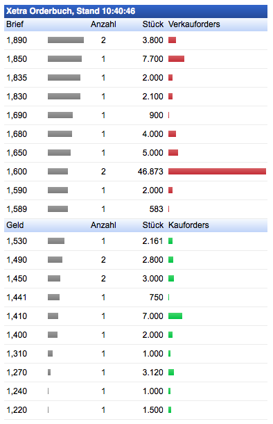 Heute waren diese Aufträge verschwunden und Kurse von über 1,60 wurden kurzfristig erzielt. Jetzt ist wieder ein 10k Verkaufsauftrag bei 1,60 platziert.