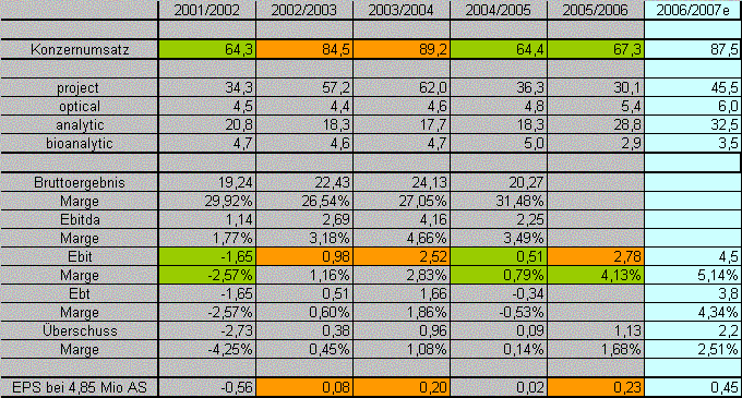 Insgesamt ist der Kursanstieg im Vorfeld der Bekanntgabe der Ergebnisse als der verdiente Lohn für ein gutes Jahr 2005/2006 zu sehen. Das war nicht immer so. Selbst nach Ansicht des Vorstandes war zum Beispiel das vergangenen Geschäftsjahr „sehr turbulent“. „Managementfehler bei Tochterfirmen“ hatten zu Einschnitten geführt. Der Umsatz im Projektgeschäft war um über 40 Prozent eingebrochen, der Konzernumsatz um rund 28 Prozent.