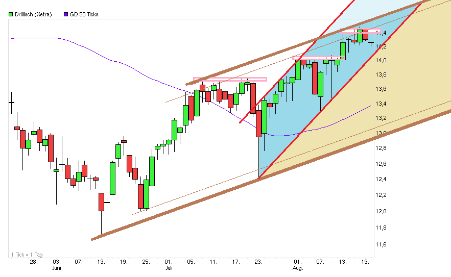 kurzfristig etwas ausgereizt zu sein, wenn die obere braune Trendkanallinie das Limit darstellen sollte. Nach ca. 2€ Anstieg in den letzten 4 Wochen darf man auch mal temporär wieder etwas vom Gas gehen. Etwas Konso ist ohnehin momentan ja auch beim TecDax angesagt. Man wartet eben auf die Minutes des FED. Theoretisch könnte man zwar auch noch nach oben ausbrechen mit dem kurzfristigen roten Trendkanal, aber dafür müßte wohl schon Drillisch irgendeine gute Sondermeldung bringen oder der Markt müßte nach oben nochmal explodieren. Warten wir es also ab, ob DRI da noch einen verstecken Pfeil im Köcher hat ;)