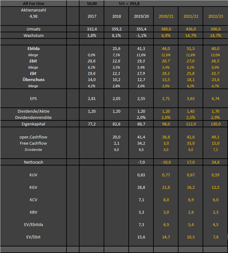 Kurzum: so sehr mir das Unternehmen auch gefällt -- es gibt gute Gründe, warum der Markt hier keinen größeren Vertrauensvorschuss gibt. Ein Unternehmen wie All for One sollte in dieser Goldgräberzeit der Digitalisierung jedes Jahr 10% wachsen können. Wenn der eigene Vertrieb das organisch nicht schafft, dann hat man immer noch die hohen Cashflows die man in Übernahmen stecken kann um anorganisch zu wachsen.