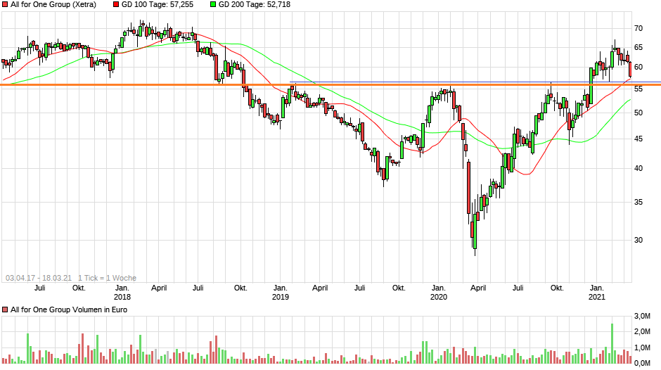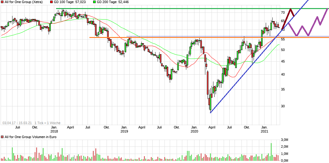 Denkbar, dass wir die Trendlinie testen und dann stark nach oben ziehen. Oder wir gehen erst noch einen Umweg auf die 56-57 € Marke zurück und drehen dann später deutlich hoch. In jedem Fall sind Kurse unter 61 € klare Kaufkurse. Deutlicher würde ich dann bei 58 € anfangen nachzukaufen.