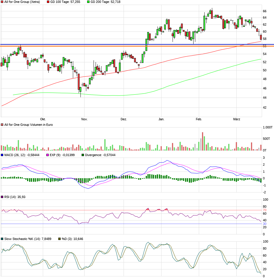 Hier sieht man nochmal sehr gut, wie idealtypisch ein Aufsetzen auf den ehemaligen Asbruchsbereich bei 56-57 € wäre, zumal auch die Indikatoren wieder auf einem Niveau angelangt sind, wo man dann im Kurs nach oben drehte. Vielleicht reicht auch schon der Test der 100TageLinie.