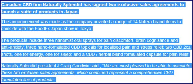Am 22.2.2017 kommt die Meldung; Naturally Splendid erweitert seine CBD-Produktlinie für die Markteinführung in Japan, Naturally Splendid gibt weiterhin bekannt, dass seine hundertprozentige US-amerikanische Tochterfirma einen Alleinverkaufsvertrag mit einem führenden CBD-Hersteller für eine komplette Reihe an Cannabinoid-Produkten unterzeichnet hat.