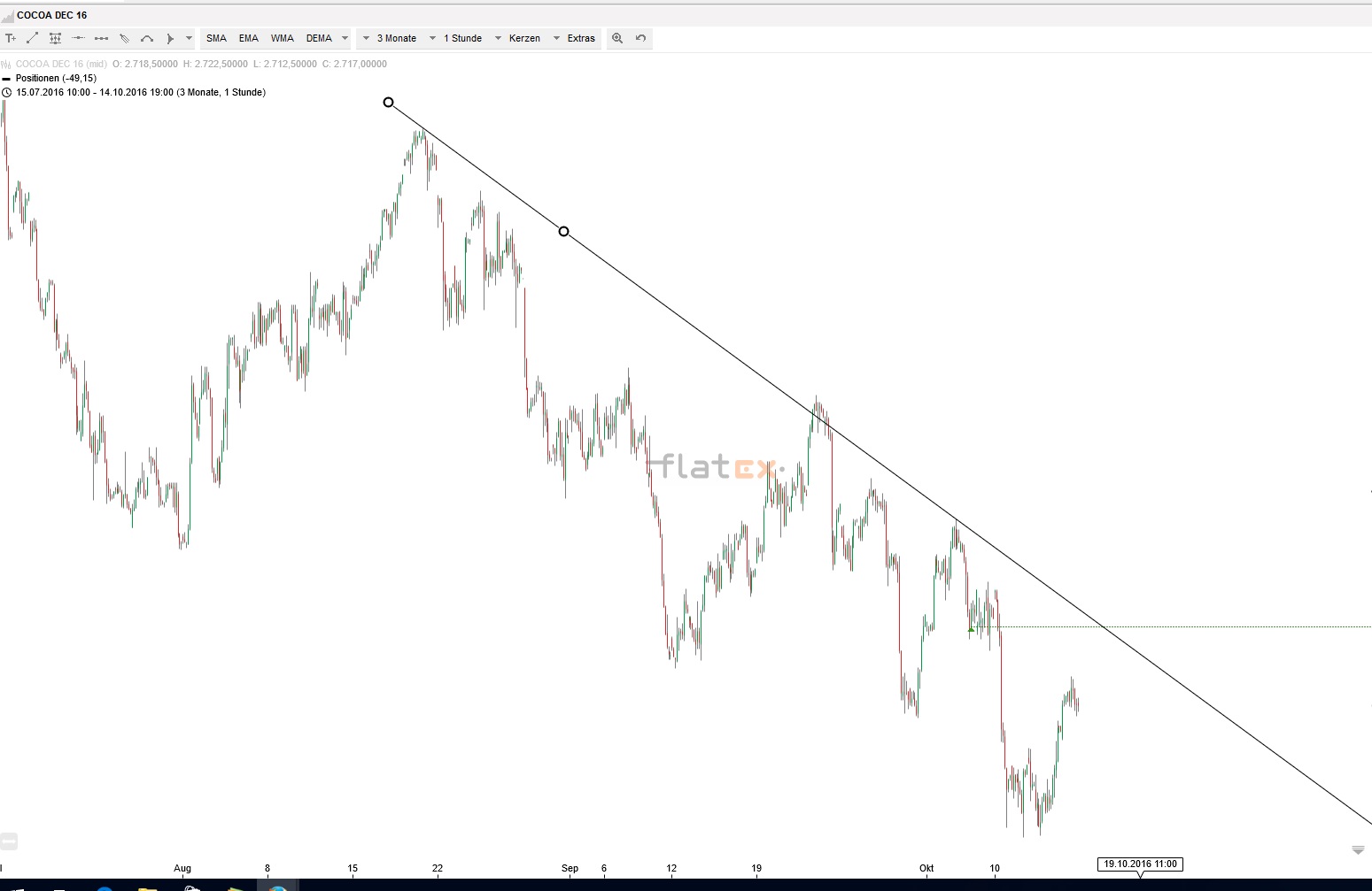 Kakao habe ich nur zum Teil verkaufen können. Noch ist ein Teil im Minus. Es gab bisher einfach nicht genug Schwankungen. Weizen werde ich den Rest nun noch halten. Öl habe ich erst in der roten Kerze nach gekauft und dann in der Gegenbewegung verkauft. Hatte Glück, war beide Male genau die Spitze.