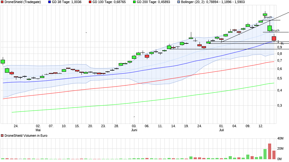 der Aktionär ... interessan­t wird sein, wie sich das Börsenmaga­zin nun bezüglich DroneShiel­d positionie­rt. Denn da der Stopkurs bei 1,20€ lag, ist man momentan raus.