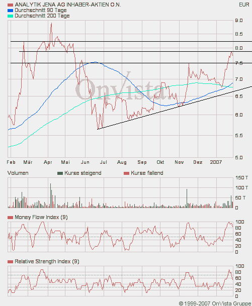 ###Ausblick: Kurzfristig sollte die ANALYTIK JENA Aktie bis ca. 8,38 Euro anziehen. Bricht die Aktie dann dieses Mal über den Widerstand aus, kommt es zu einem langfristigen Kaufsignal mit Zielen bei 11,30 und später 21,57 Euro. Es kann allerdings durchaus zu einem kurzen pendeln um die Marke kommen. Prallt die Aktie aber an diesem Widerstand ab, wären Abgaben bis an den langfristigen Aufwärtstrend seit 2003 bei aktuell 6,65 Euro zu erwarten.###