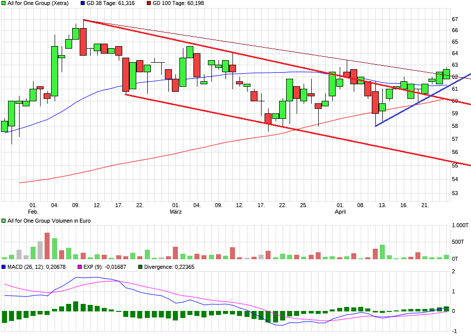 Die ebenfalls steigende 100 tageLinie verläuft bei 60 €.