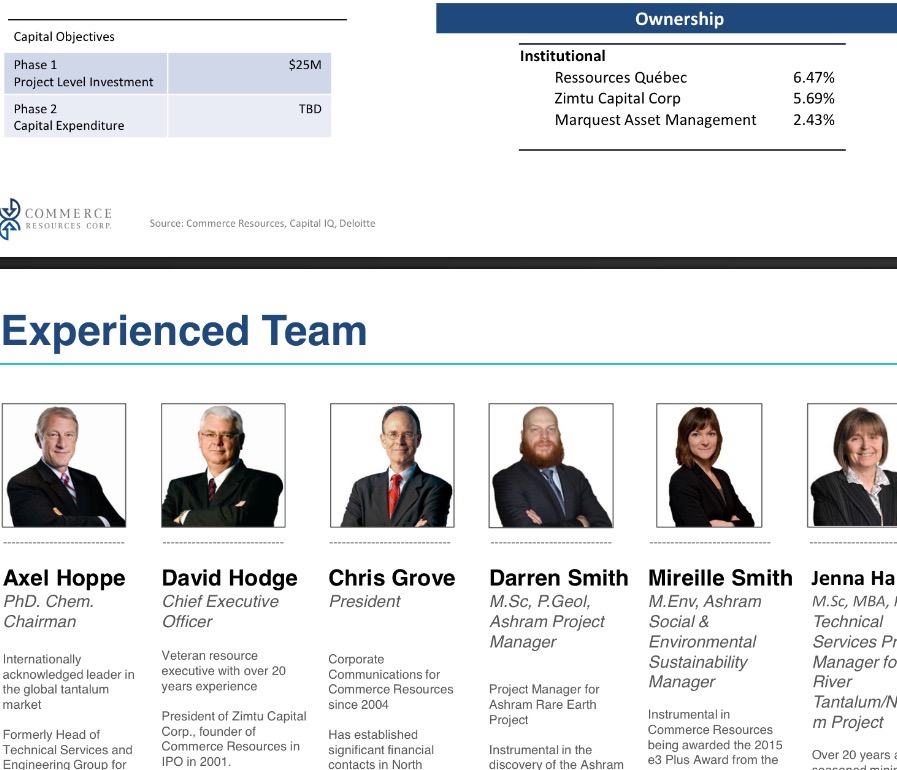 Seit mehr als einem Jahr, seit Beteiligung im Februar 2017, https://www.commerceresources.com/en/news/...t-from-ressources-quebec , ist Quebec und Zimtu und Marquest gleichbleibend beteiligt an Commerce Resources.