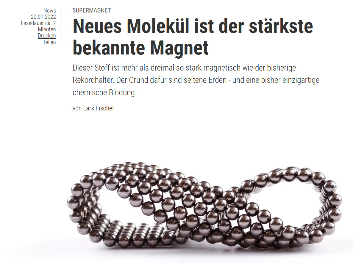 Das ist nicht nur mehr als das Dreifache des bisherigen Rekords von 7,9 Tesla, sondern auch fast das Doppelte der maximal möglichen Feldstärke in gängigen Messapparaturen, so dass das Team bisher keinen exakten Wert nennen kann. Solche superstarken molekularen Magnete sind einerseits interessant für Speichermedien, die auf magnetisierbaren Stoffen basieren. Andererseits ist laut dem Team aber auch vorstellbar, aus diesen Molekülen große Magnete für andere technische Anwendungen zusammenzusetzen. Deren Magnetfeldstärke würde die heutigen »Supermagnete« auf Basis von neodymhaltigen Legierungen noch einmal deutlich übertreffen.