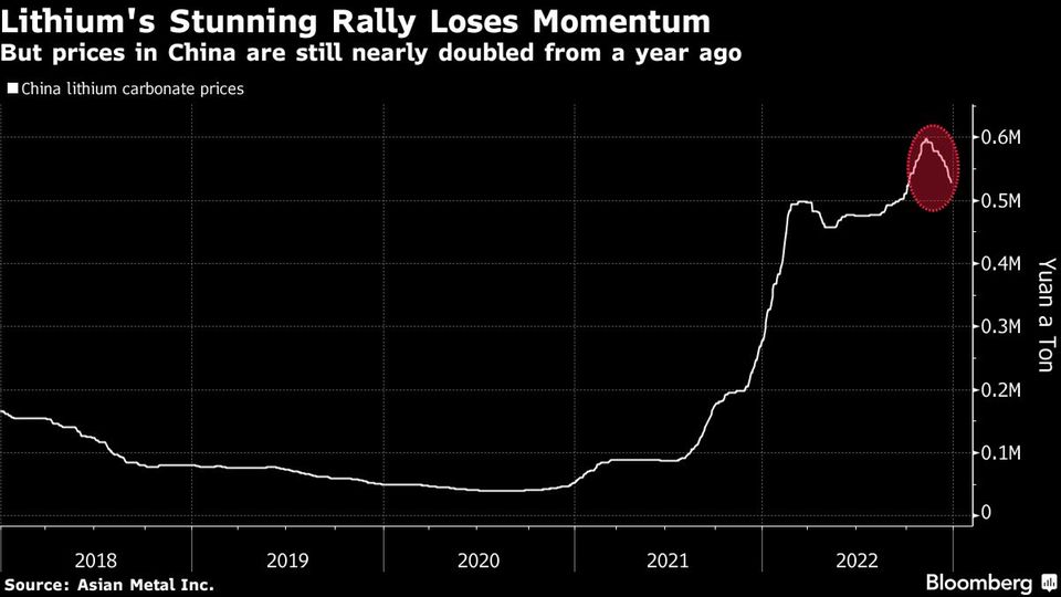 „In den nächsten sechs Monaten wird die schwache Nachfrage wahrscheinlich die Diskussionen um den Lithiumpreis dominieren, da die Nachfrage in China durch die Streichung von Subventionen und den Anstieg der Covid-19-Fälle belastet wird“, teilte die Analystin Alice Yu von S&P Global Commodity Insights per E-Mail mit. „Die Verbraucher im Westen sehen sich mit wachsenden Problemen bei der Erschwinglichkeit konfrontiert.“