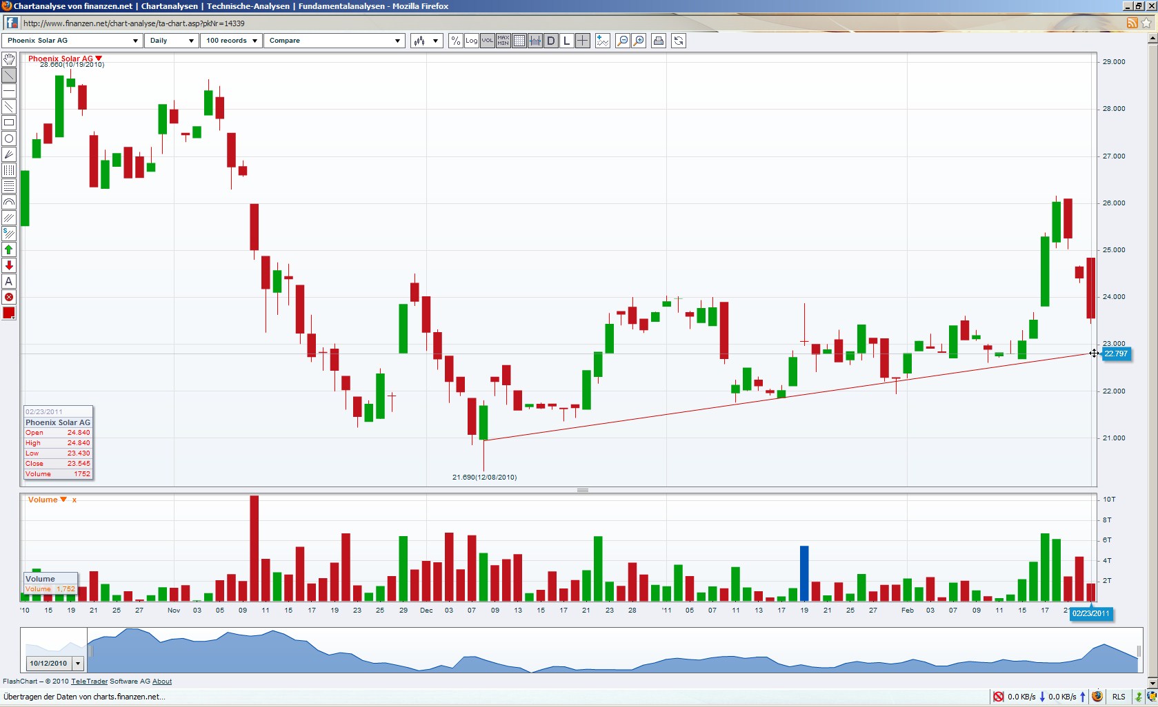 Jedoch hat die Gesamtmarktkorrektur einem weiteren Anstieg einen Strich durch die Rechnung gemacht und auch Phoenix Solar korrigierte letztendlich auf 22,50 Euro.