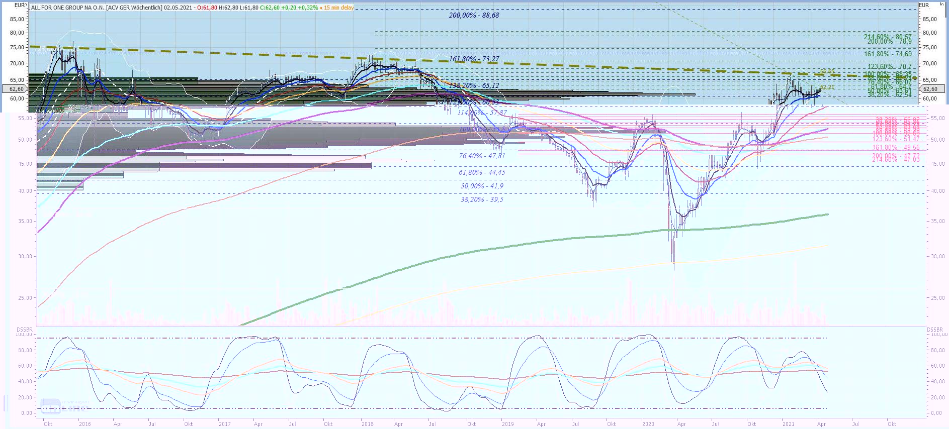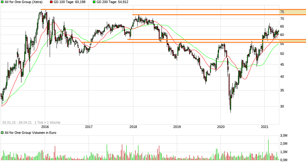na ja, für mich ist klar, dass wir unten im weekly eine klare Unterstützungszone haben, die von 56 bis 60 € reicht, weil da diverse horizontale Auflagepunkte liegen, plus 100+200 Tagelinie, die zudem auch noch steigen und bullish kreuzten. Mehr muss man als Anleger nicht wirklich wissen, meines Erachtens.