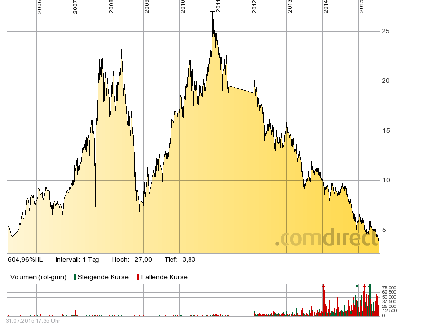 was ist gut an einer Aktie, die innerhalb von 12 Monaten ca. 50% an Wert verliert? Vor ein paar Wochen waren noch einige stolz darauf die Papiere für ca 5€ erhalten zu haben. Und heute sin wir bei 4€. Es kann wieder einmal bergauf gehen, aber momentan sehe ich das nicht.