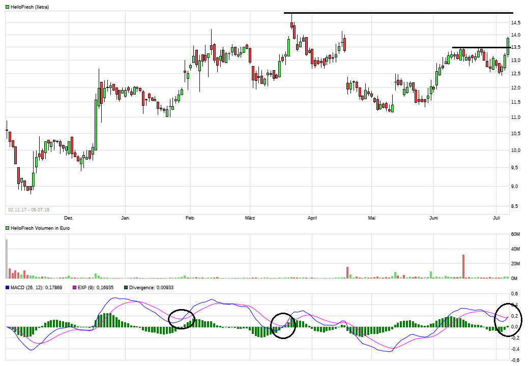 Die charttechnische Situation bei HF sieht gut aus. Der MACD deutet ein neues Kaufsignal bisher nur an aber falls es kommen sollte könnte es unterstützend für die Aktie wirken auf dem Weg zum ATH.