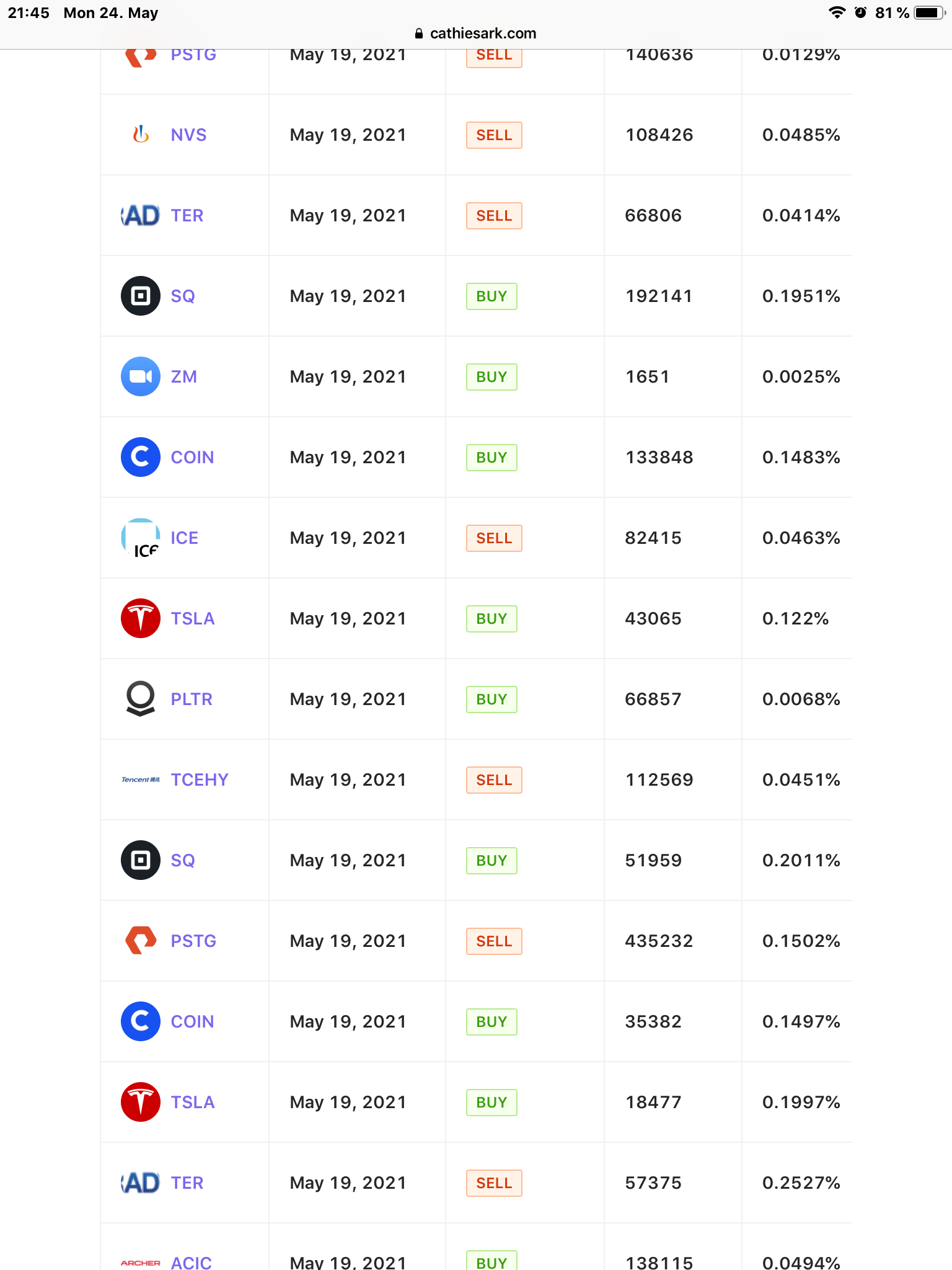 Woods hat zuletzt weiter gekauft bei Square, die letzten trades zu Square waren am 19.5., und das waren Käufe. Andererseits verlor ihr etf zuletzt erheblich, das hat viele verschreckt und sind raus, da musste sie vermutlich auch Cash bereitstellen