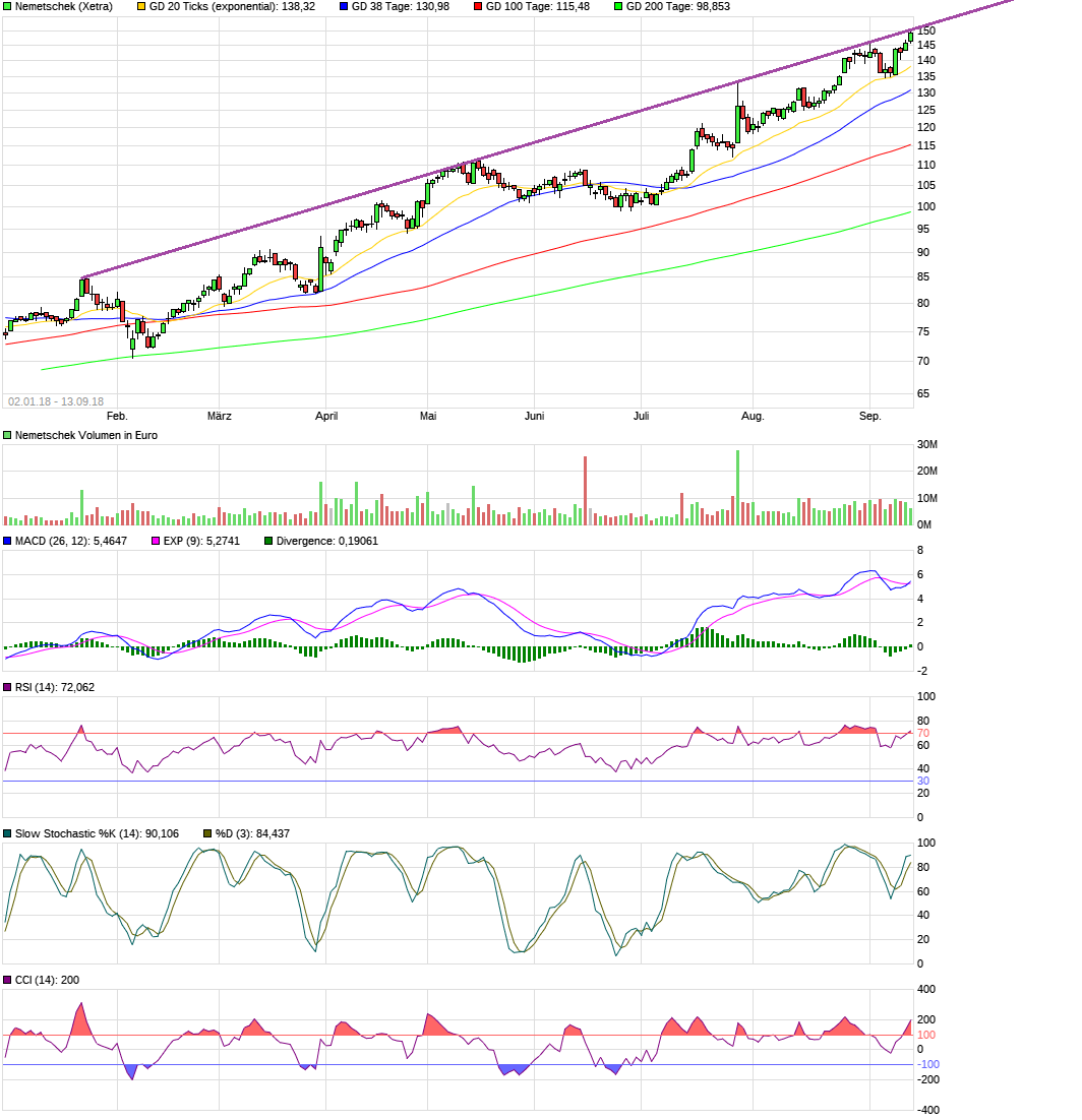 weil ich natürlich auch Teilverkäufe getätigt habe, die ich dann bei der nächsten Aufwärtswelle wieder investiert habe und bei der nächsten Korrektur wieder verkauft habe. Im Grunde behalte ich seit 5-6 Wochen (als der Kurs erstmals auf 130 € stieg) immer eine 1% Shortposition auf Nemetschek, die ich in Übertreibungen auf 2% aufstocke. Die 1% Tradingposition verkaufe ich dann wieder mit Gewinn nach einer kurzen Korrektur, und die andere 1% lasse ich laufen, falls mein Grundszenario irgendwann mal aufgeht, also eine Korrektur bis 100-110 € irgendwann innerhalb der nächsten 6-9 Monate.