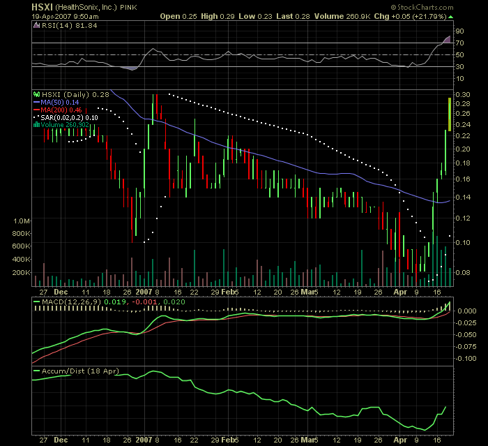 HealthSonix, Inc. (PINKSHEETS: HSXI) HealthSonix, Inc. closed at $.32 Thursday, up $.09 (39%) over Wednesday's close, trading 1,362,851 shares.