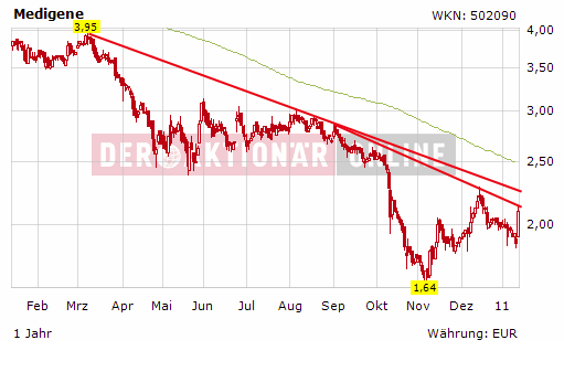 Die Medigene-Aktie kann heute infolge der Meldung deutlich zulegen und notiert prozentual zweistellig im Plus. Seit Erreichen eines neuen Allzeittiefs im November 2010 bei 1,64 Euro versucht sich der Titel an einer charttechnischen Bodenbildung. Diese ist aber noch nicht abgeschlossen. Erst bei einem Bruch der Abwärtstrends wäre weiteres Aufwärtspotenzial vorhanden. DER AKTIONÄR stuft die Medigene-Aktie daher weiter als eine Halteposition ein.