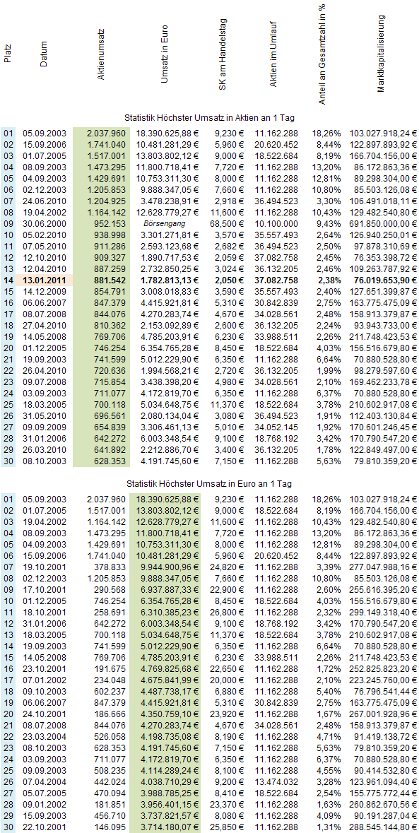 Hab auch Tabellchen in Sachen gehandelter Umsatz in €... Nicht nur Aktien.. Falls Interesse kann ich ja heut Abend mal beide Tabellchen hier reinposten.. 1x Aktienumsatz und 1x Umsatz in €, jeweils die Top 30 aller 2681 Handelstage bisher..