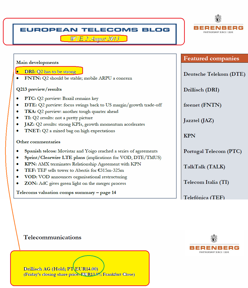 und Anfang August hat ja die Berenberg Bank einen breite europäische Sektor-Analyse gemacht und auch da DRI nur mit KZ14 bewertet.