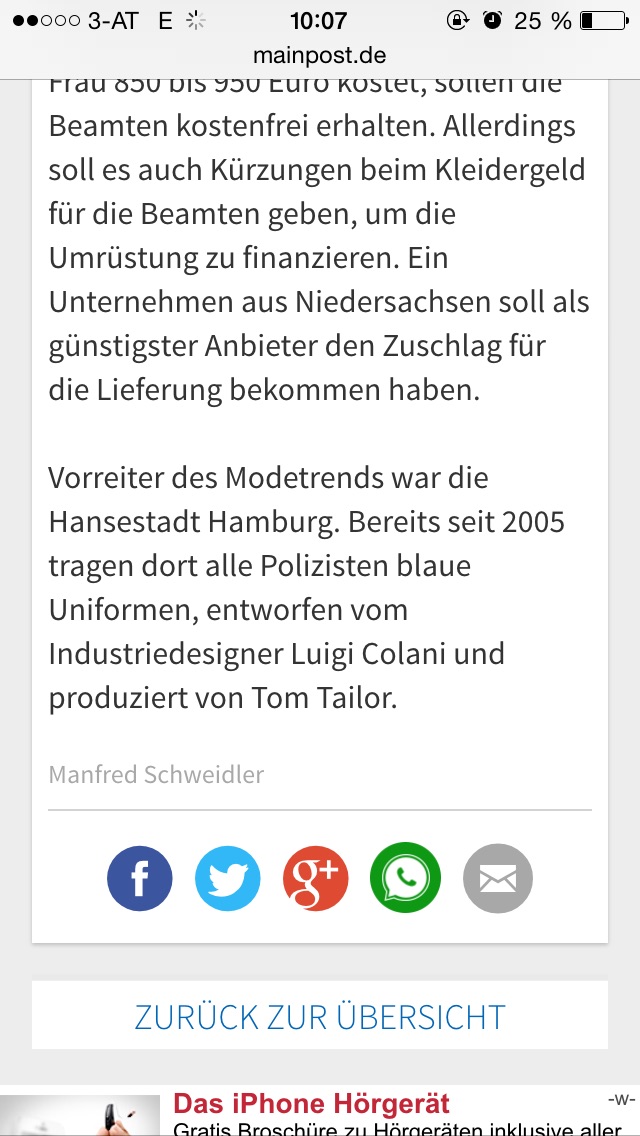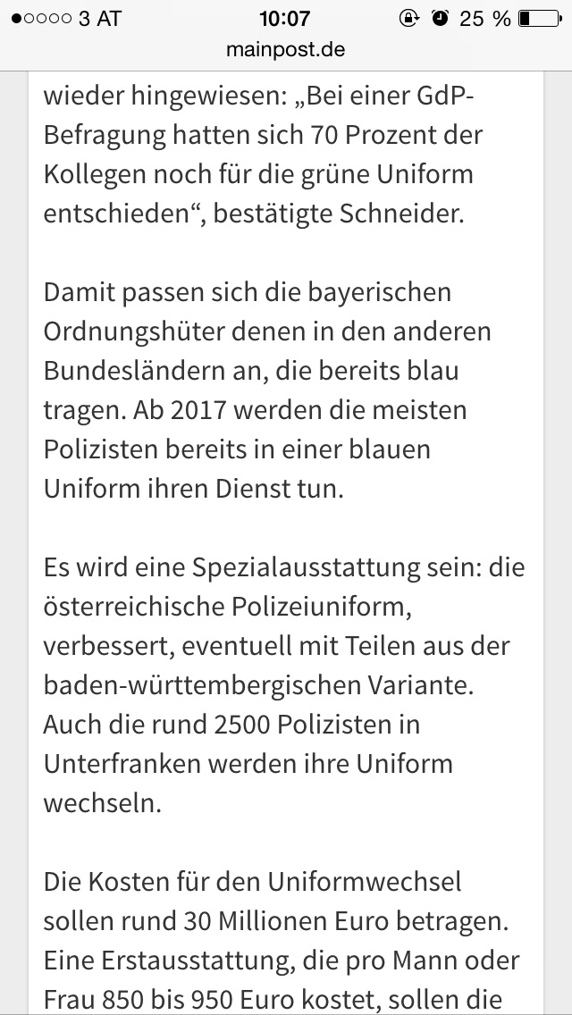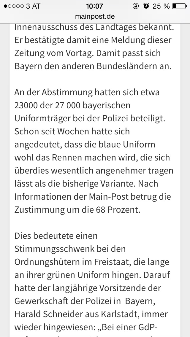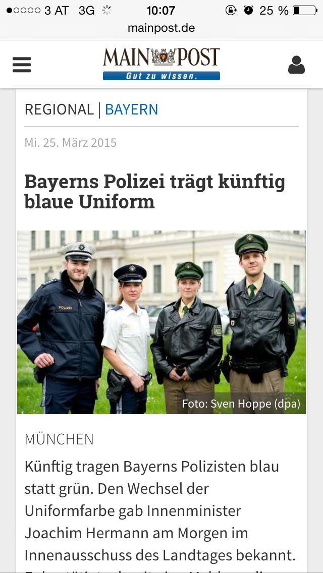 Nebenbei habe ich letzte Woche einen Beitrag im TV auf BR gesehen, dass die Polizei in Bayern ab 2016 mit blauen Uniformen von Tom tailor ausgestattet wird.
