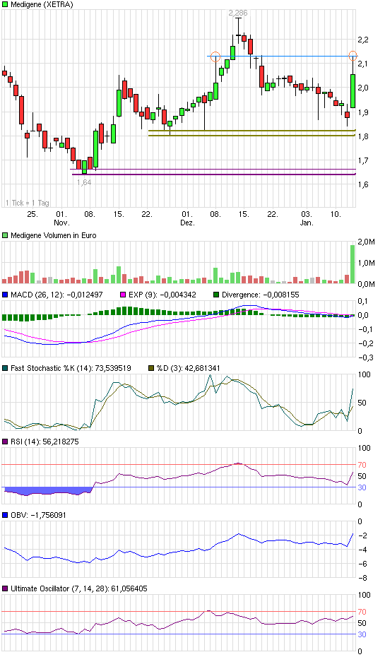 Chartechnisch sollte Luft sein bis 2,50. Allerdings hat man gestern auch gut beobachten können wie viel Spekulation in Medigene steckt. Kaum zieht die Aktie an kommen riesige Volumina auf den Markt. Gut möglich das massenhaft Trader auf die kurze Erholung spekulieren und mit 5-10% Kursanstieg bereits zufireden sind. So kann es eben auch passieren das die Aktie Intraday starke Schwankungen hinlegt.