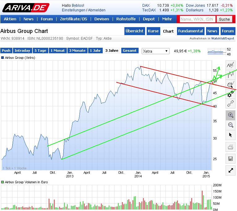 Insgesamt sehe ich die potenziellen Produktionsprobleme aber allenfalls als mögliche Einmalkosten an. Langfristig sollte die Wucht der verbesserten Wettbewerbsposition durch den niedrigeren Euro und die stetige Steigerung der Produktion von bereits bestellten Maschinen hier die Aktie weiter in die richtige Richtung treiben. Insofern mache ich mir wenig Gedanken darüber, ob 2015 ein Superbörsenjahr für Airbus wird oder nicht.