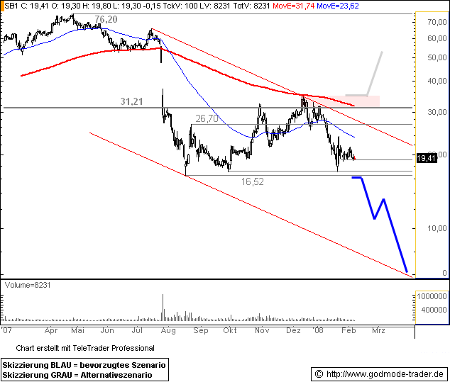 Ein nachhaltiger Rückfall unter 16,52 Euro sollte zu einer Stop Loss Lawine führen und die Aktie unter erheblichem Verkaufsdruck bis 11,00 - 12,00 und auf mittelfristige Sicht bis 6,00 - 6,60 Euro zurückfallen lassen. Eine zuvor noch mögliche Kurserholung bis 23,60 oder 26,70 Euro würde dieses bärische Szenario zunächst nicht gefährden.