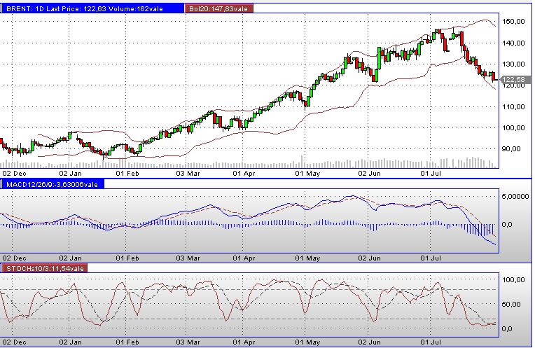 This morning we saw a sharp drop in the price of crude oil futures as a result of decreased U.S. demand of gasoline. Oil futures have now fallen to ~18% from July 11 prices, when oil almost reached the $150 marker. Light, sweet crude on the NYMEX for September delivery contracts traded $3.31, or 2.7%, lower at $121.42 a barrel making it a low since May 15th.