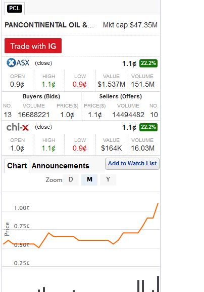 PCL hat gute Karten im Spiel ums Öl Offshore Afrika, zumal die nächsten,ich glaube 3 Bohrungen, bereits bezahlt sind. Das Interesse, gerade Offshore Afrika, wird größer. PCL ist dort mit riesigen Gebieten glänzend vertreten. Sie waren im letzen Jahr die ersten die durch eine Bohrung auf GAS gestossen sind (kommerziell leider nicht nutzbar, weil zu klein)..