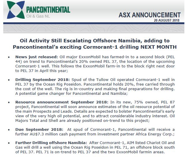 Pancontinental Oil & Gas NL (“Pancontinental”, “the Company”) is pleased to announce that Tullow Kudu Limited, a subsidiary of Tullow Oil (“Tullow”), has elected to continue as a participant in the joint venture in Namibian licence PEL 37 and, as such, is committedto drilling one exploration well subject to identifying a drillable prospect.