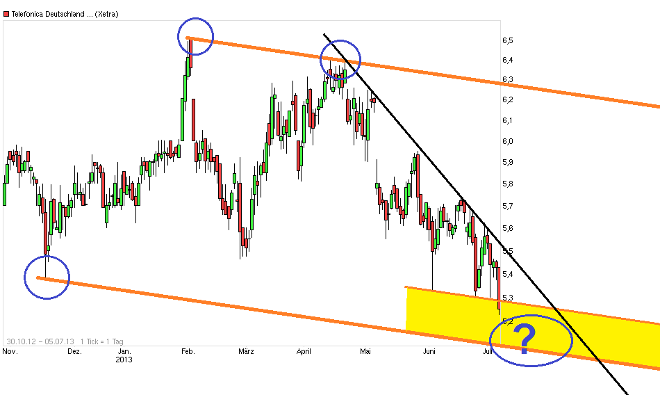 Telefónica Deutschland-Aktie floppt - Druck bei Umsatz und Margen dürfte anhalten - 05.07.13 - http://www.ariva.de/news/...msatz-und-Margen-duerfte-anhalten-4592888 => ".... Am 25. Juli 2013 kommen die Q2-Zahlen von Telefónica Deutschland raus. Die Analysten vom Bankhaus Lampe erwarten für die Q2-Zahlen anhaltenden Druck auf Umsatz und OIBDA-Marge. Neben einem anhaltenden Umsatzrückgang im Festnetzgeschäft sollten auch die Umsätze im Mobilfunkgeschäft zurückgegangen sein. Belastend dürfte neben den Ende 2012 gesunkenen Terminierungsentgelten auch ein hoher Marketingdruck der Hauptwettbewerber T-Mobile/Vodafone gewirkt haben. In H1 dürfte das Gesamtjahresziel, die OIBDA-Marge ggü. dem Vorjahr zu steigern, noch nicht erreicht worden sein. Ein Risiko für zukünftige Dividendenzahlungen stelle eine mögliche Spektrum-Auktion 2014/15 dar, welche neben den 2016 auslaufenden "GSM-Lizenzen" auch zusätzliches Spektrum ("digitale Dividende 2") beinhalten könnte. Sollte sich die Bundesnetzagentur für einen Auktionsprozess analog der vorangegangenen Auktion ("LTE-Auktion 2010") entscheiden, könnte dies für Telefònica Zahlungen von über 1 Mrd. Euro auslösen. Ein Verzicht auf Spektrum würde die mittel- und langfristige Wettbewerbsfähigkeit verschlechtern. Positiv könnten sich für Telefònica mögliche Einsparungen durch Netzwerkkooperationen auswirken. Die Analysten vom Bankhaus Lampe bestätigen ihr Kursziel von 5,50 Euro und ihre Anlageempfehlung "halten". Die Telefónica Deutschland-Aktie gehört aktuell zu den Flops im TecDAX und notiert derzeit (16:15 Uhr) im Xetra-Handel mit einem erheblichen Minus von 2,43% bei 5,294 Euro. (05.07.2013/ac/a/t)
