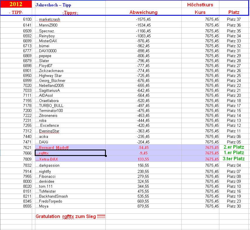 Wenn man sich so Vots anschaut von Usern fragt man sich ob die überhaupt die Umfrage behirrnt haben ! Die Umfrage war ".......das Jahreshoch 2013" Jahreshoch ! also das Hoch des Jahres das entweder noch kommen kann oder gleich bei Eröffnung das Jahreshoch sein wird. 7.612,39 comdirekt schloßen wir ..okay ein User meint 07. Tipp....7.501....afruman also sollen wir mit einam Gap eröffnen und dann das ganze jahr darunter bleiben ..okay am Papier möglich, gut lass ich mir einreden 41. Tipp....4.500....EC , 20. Tipp....7.000....swist , hingegen ja ja würden 600 Punkte gap und 3.100 Punkte Gap vorraussetzen ? hmmmm da Fehlen einen die Worte, solche "Mitarbeiter" möchte ich nicht haben ... auch wenn ich ihnen Null Geahlt zahlen müsste, das Risiko das die so "mitdenken" im Arbeitsleben und damit in der Firma Schaden anrichten wäre mir zu groß. So mein Tipp Jahreshoch nach einer Korrektur die nun kommen kann, dann auf 7800 vielleicht, doch das Jahr sehe ich ehender rot als im plus viel Seitwärts
