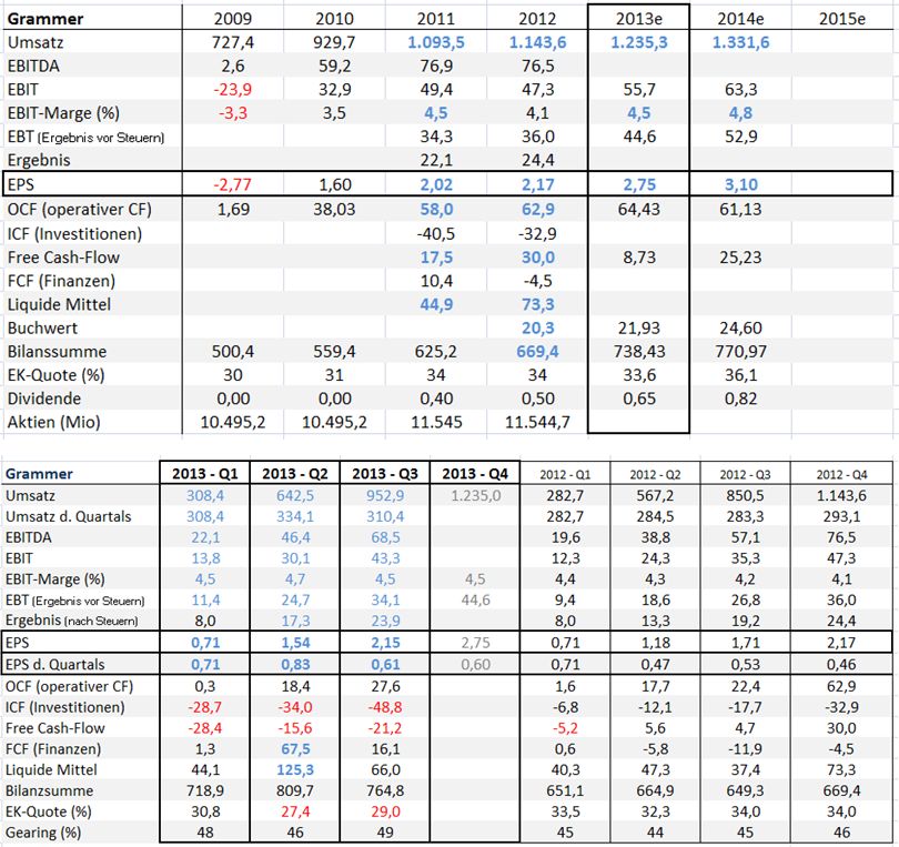 Von mir aus kann es gern auch noch weiter rutschen - ich kaufe gern nach. Cash ist genug da. Hab nicht nur Grammer-Posi vor 10 Tagen um 60% reduziert, um Cash bei Einbrüchen zu haben. Hab nur leider schon ab 34 EUR angefangen einzusammeln. Hab nicht damit gerechnet, dass es nach solch klasse Zahlen plus deutlich pos. Ausblick auf 2014/15 soweit runtergeht. Etwas ärgerlich. Aber den "Fehler" mach ich immer wieder, wenn die Cash-Posi mächtig groß ist. Und Bodenbildungen bei Grammer gibt es nicht. Immer schnelle Rebounds von -2% auf +10% am Tag. So wird es auch in den kommenden Tagen sein... Egal. Alles um 30 sind schöne Kaufkurse (KGV 2014 <10)... Und unsere verehrte Kanzlerin hat ja auch nochmal ganz, ganz, ganz ausdrücklich gesagt (an alle, die beruhigt werden müssen), dass es keine militärische Auseinandersetzung geben wird... Als Absatz- und Beschaffungsmarkt spielt Russland für Grammer auch keine Rolle. Auswirkungen durch Sanktionen gg Russland für Grammer also auch "wurscht"... Zielkurs bis Ende 2014 bleibt in meinen Augen sehr sicher 40-45 Euronen...