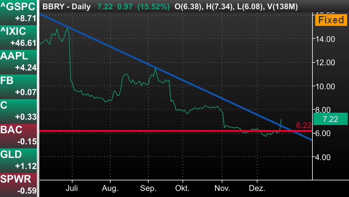 Für mich ist es wahrscheinlich, dass es in den kommenden Wochen einige Aufs und Abs im Kurs geben wird, da natürlich auch viele Zocker/Daytrader dabei sind. Aber auf lange Sicht bin ich ziemlich überzeugt davon, dass Blackberry die Kurve kriegen wird. Sehe dabei nicht Chen als Heilsbringer schlechthin, sondern glaube vielmehr, dass die Marke Blackberry für deutlich mehr steht als nur Smartphones. Ohne auf dem Gebiet Experte zu sein, halte ich den "Wert" der Lizenzen/Patente/Kooperationen für immens.
