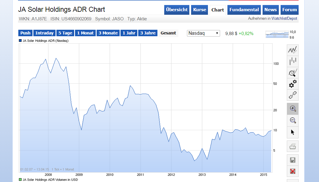 Über der sehnsüchtig erwartende 10 $-Marke drüber. Ein viel besseres charttechnisches Signal kann es ja fast nicht mehr geben. Dazu ist JA eigentlich im Vergleich zu den anderen China-Solaris in diesem Jahr ein (kleiner) Underperformer. Von der fundamentalen Seite her wird JA von einigen etwas skeptisch betrachtet, da man einen hohen Absatzanteil in Japan hat und aufgrund des schwachen Yens Preiszugeständnisse gemacht werden müssen.