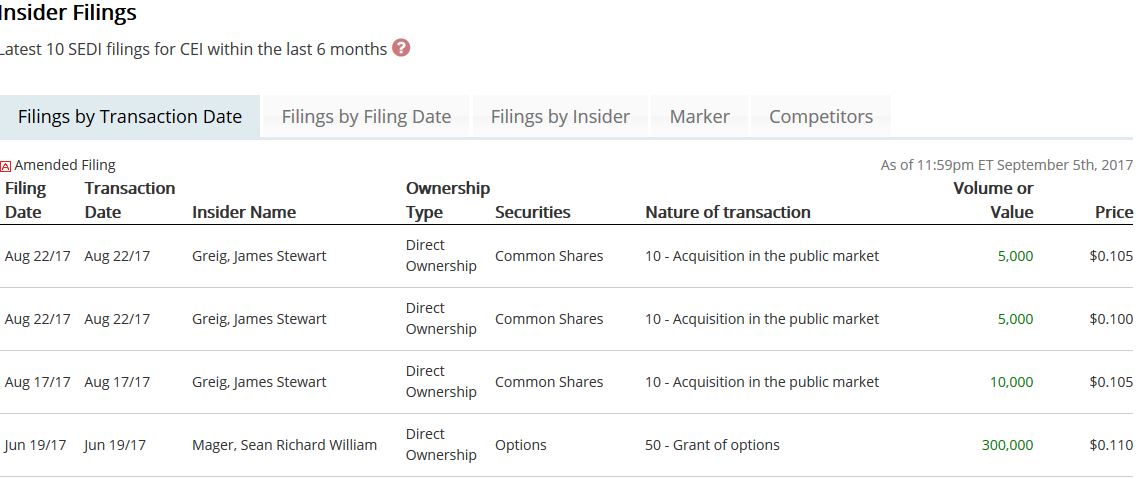 nsiderkauf.. https://www.canadianinsider.com/company?menu_tickersearch=CE… Nov 15/17 Nov 15/17 Greig, James Stewart Direct Ownership Warrants 11 - Acquisition carried out privately 142,857 $0.070 Nov 15/17 Nov 15/17 Greig, James Stewart Direct Ownership Common Shares 11 - Acquisition carried out privately 72,857 $0.070